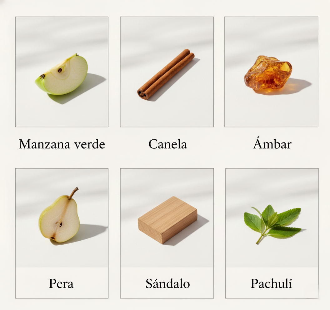Fresco-especiado, frutal, cálido y amaderado; moderno, vibrante y con un toque nocturno y seductor.